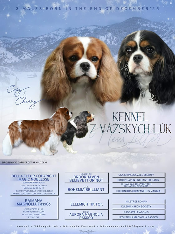 pre šteniatka Cavalier King Charles španiel vo všetkých farbách, po zdravotne vyšetrených rodičoch a dlhovekých predkoch.